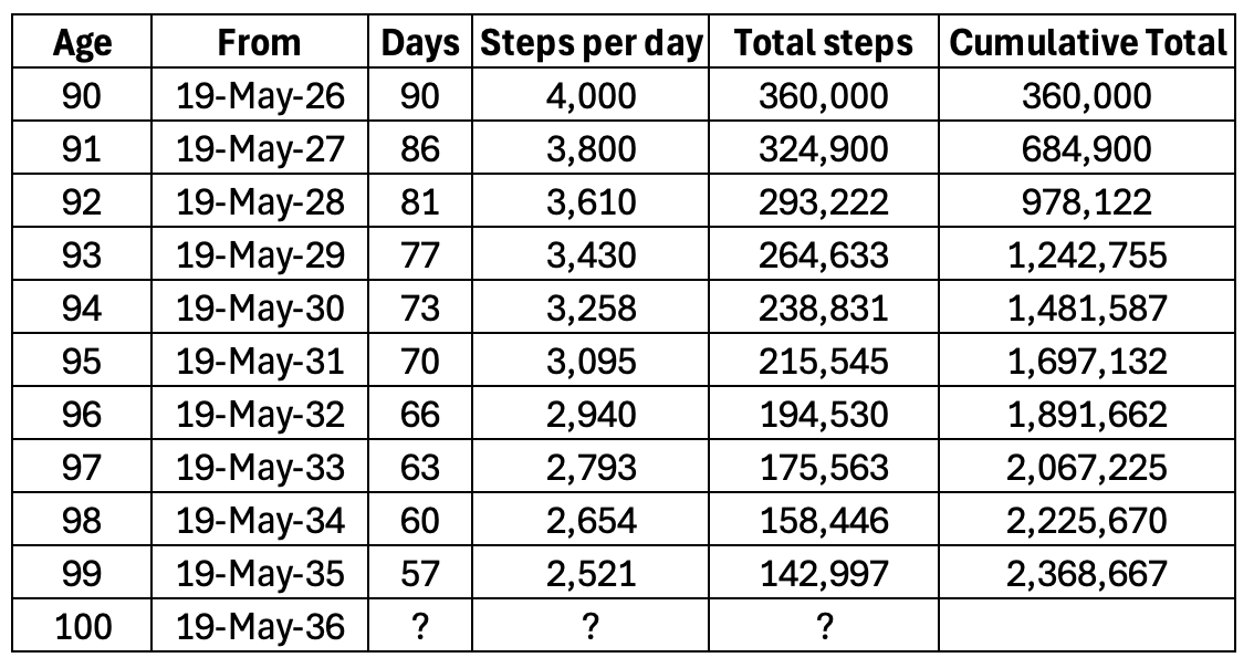 On each of the ninety days following his 90th birthday on 19th May 2026 Gerald proposes to walk at least 4000 steps, or 28,000 in the week, and annually after each birthday in the following nine years, after allowing an annual cumulative 5% reduction in the aims to compensate for increasing old age. You can make a donation in support of this Odyssey here: